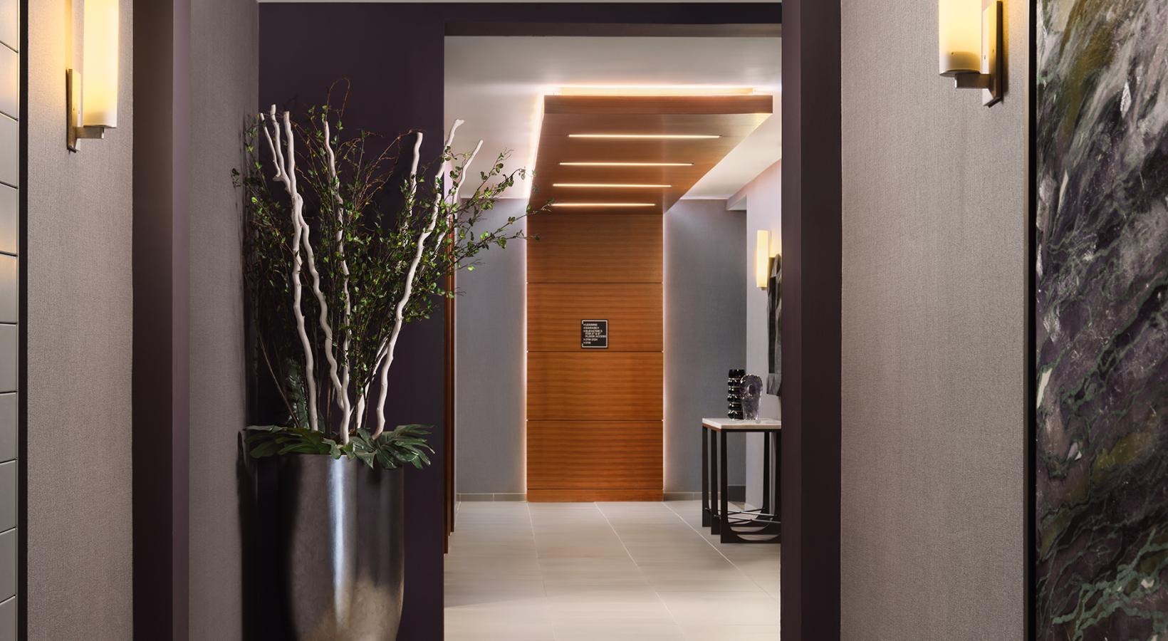 • a hallway with a vase of flowers
